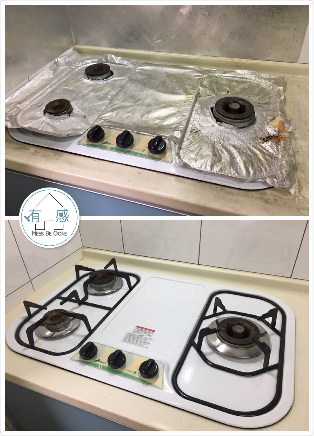 顧客告訴我們廚房一直以來都是她的大煩惱啊RRR,好幾年來都沒有時間好好的整理。 首先,許多人家中都會在廚房貼上一些錫箔紙防油噴到牆壁上,