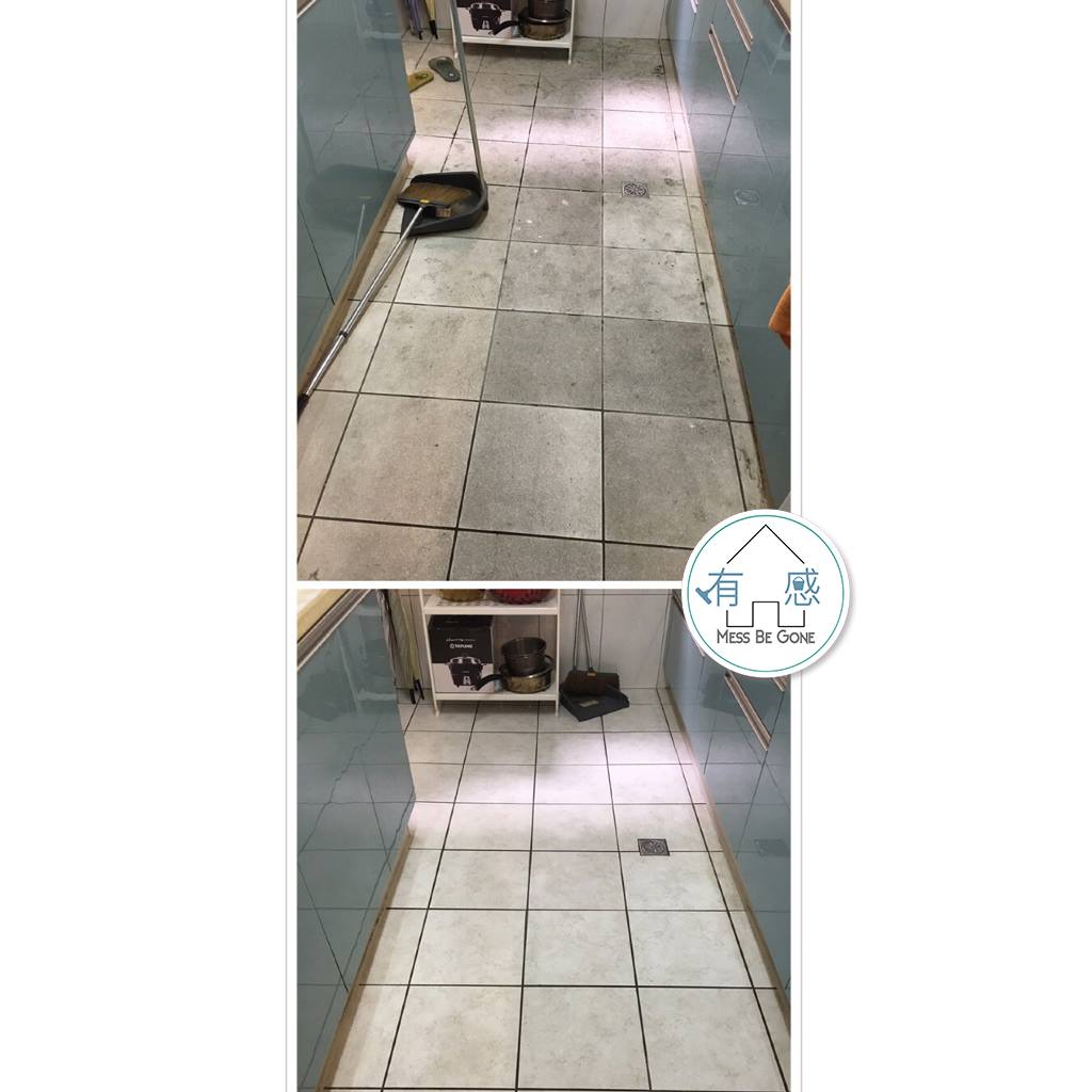 地板的陳年油污我們則使用菜瓜布與有感特調環保清潔劑,細細刷洗兩次將油污完全去除,
